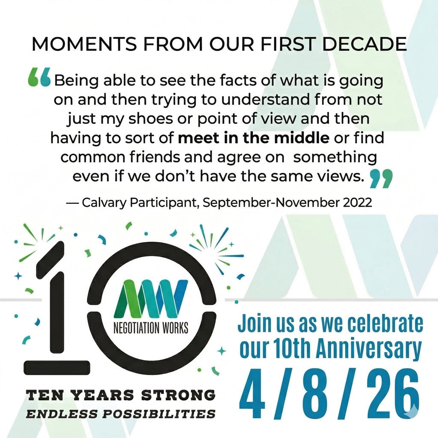 By analyzing their BATNAs in any given situation, participants can achieve solutions that are specifically tailored to their needs. Participants sometimes find it best to resolve a situation via negotiated agreement; other times, walking away and exercising their BATNA leads to a better outcome. This lesson, while perhaps unexpected in a class on resolving disputes, is a memorable one that seems to resonate deeply with many participants. Mary, from Reach Up, reflected at the end of the course, “The BATNA concept is very useful so you can know to cover all your bases and weigh the pros and cons of a situation.” Knowing one’s BATNA is powerful because it allows a negotiator to make a careful, independent assessment in every situation as to what will lead to the most satisfactory outcome. Understanding the power of BATNA is a crucial part of Negotiation Works’ strategy to empower our participants as confident, competent negotiators.