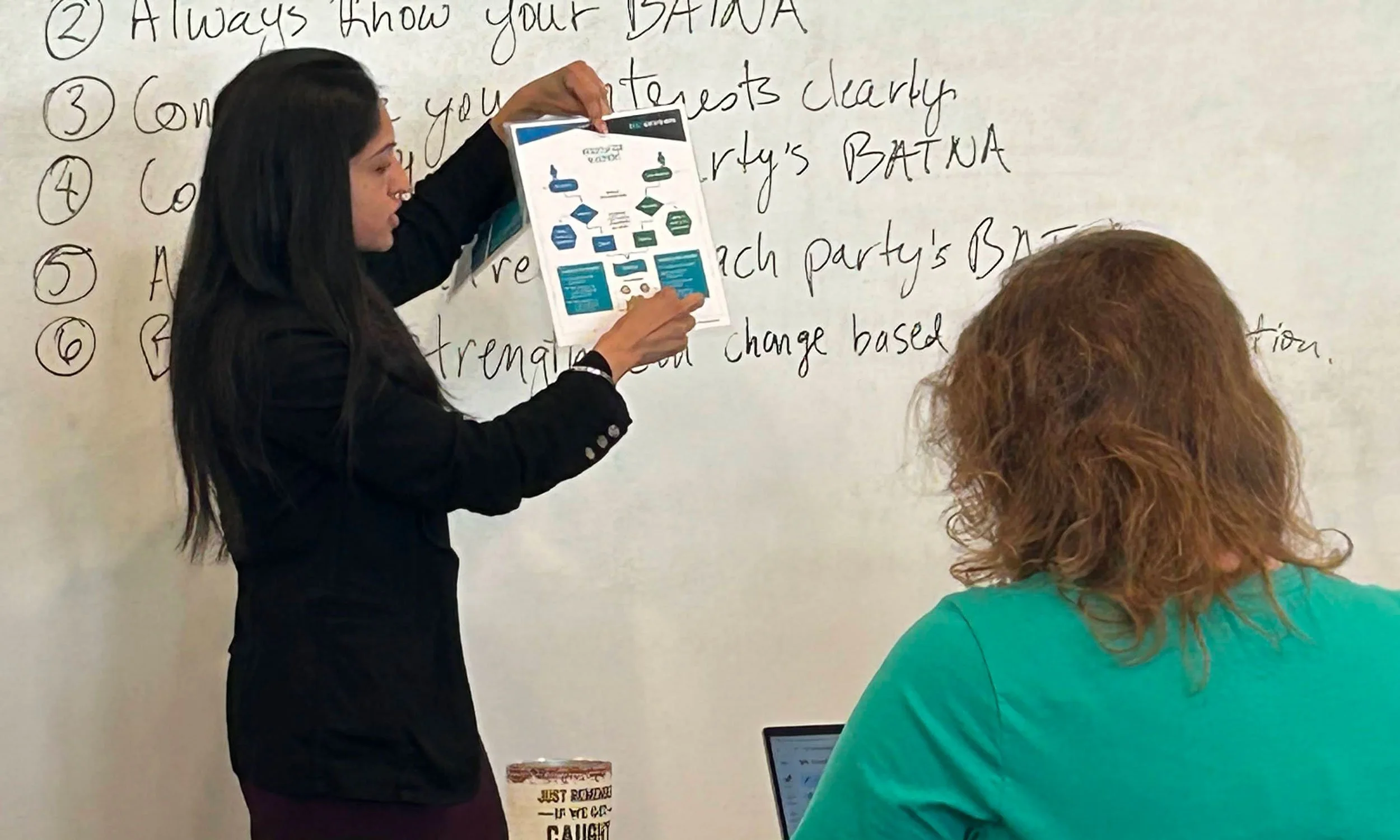 We provide these negotiation skills courses for the clients of our community-based partner organizations, tailoring each course by choosing and customizing scenarios relevant to the group. Led by staff members and trained volunteer instructors, our courses typically consist of four to eight classes, depending on the needs and preferences of the partner.